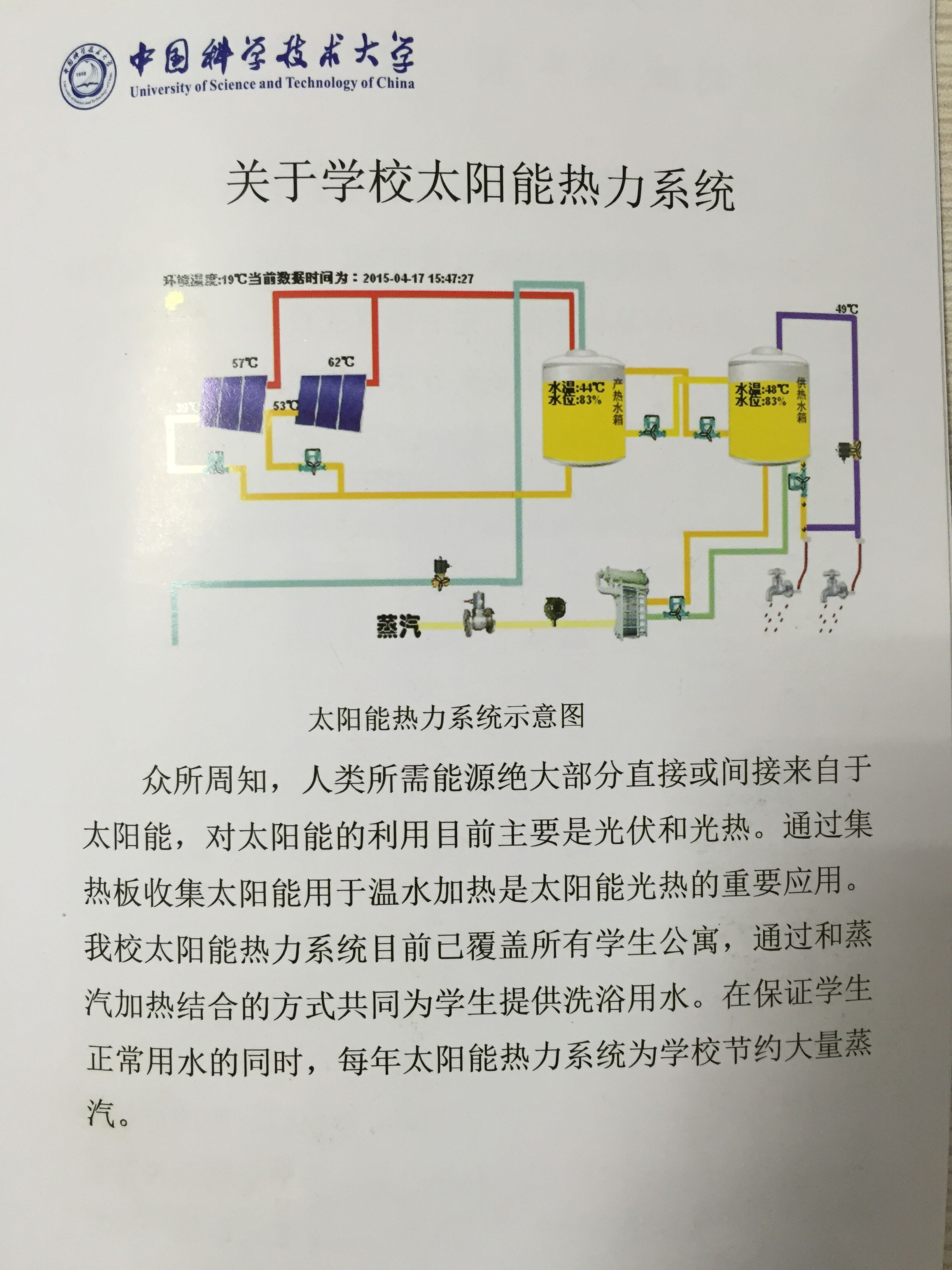 为了提倡节能减排、保护环境的理念,倡导低碳环保生活,为了社会的可持续发展,中国科学技术大学在资产与后勤保障处的校团委的大力支持下,力荐节能减排,学校的太阳能热力系统由我公司:合肥市日与节能科技有限公司 设计安装。